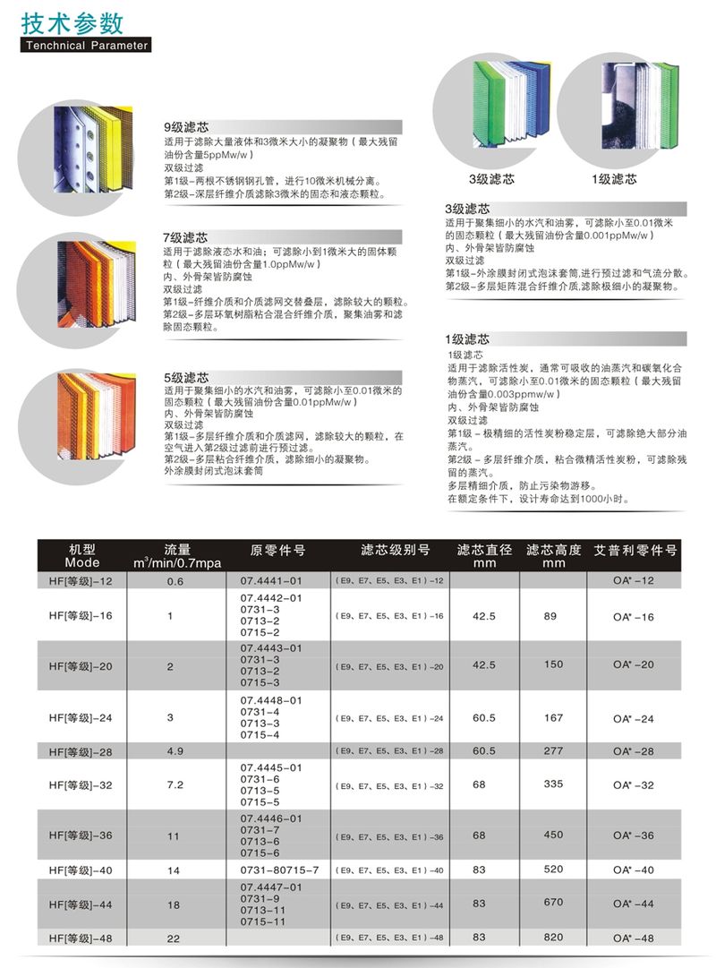 產(chǎn)品說明:1、油氣分離器濾材選用美國HV與美國Lydall公司生產(chǎn)的超細(xì)玻璃 纖維復(fù)合濾材制作。正常工況下,壓縮空氣油霧顆粒可以控